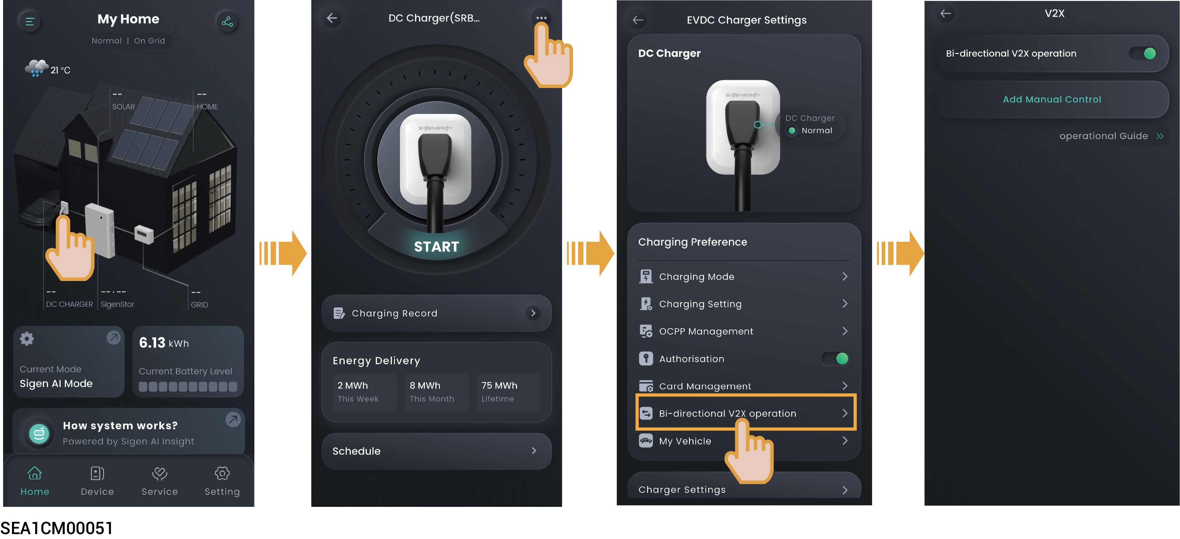 * When "Authorisation" is set to <img src="https://244528137-files.gitbook.io/~/files/v0/b/gitbook-x-prod.appspot.com/o/spaces%2F2rb52sZgapQdqSE8G2nd%2Fuploads%2Fgit-blob-659e25e4de4970ae6cf91f2c77b65d271fbbdb68%2Fimage%20(2).png?alt=media" alt="" data-size="line">, and the charging connector is properly plugged in, you can set the discharge time period and power for SigenStor EVDC via "Add Manual Control". If SigenStor EVDC is discharging during the set time period and you want to force stop, tap "Stop Discharging".